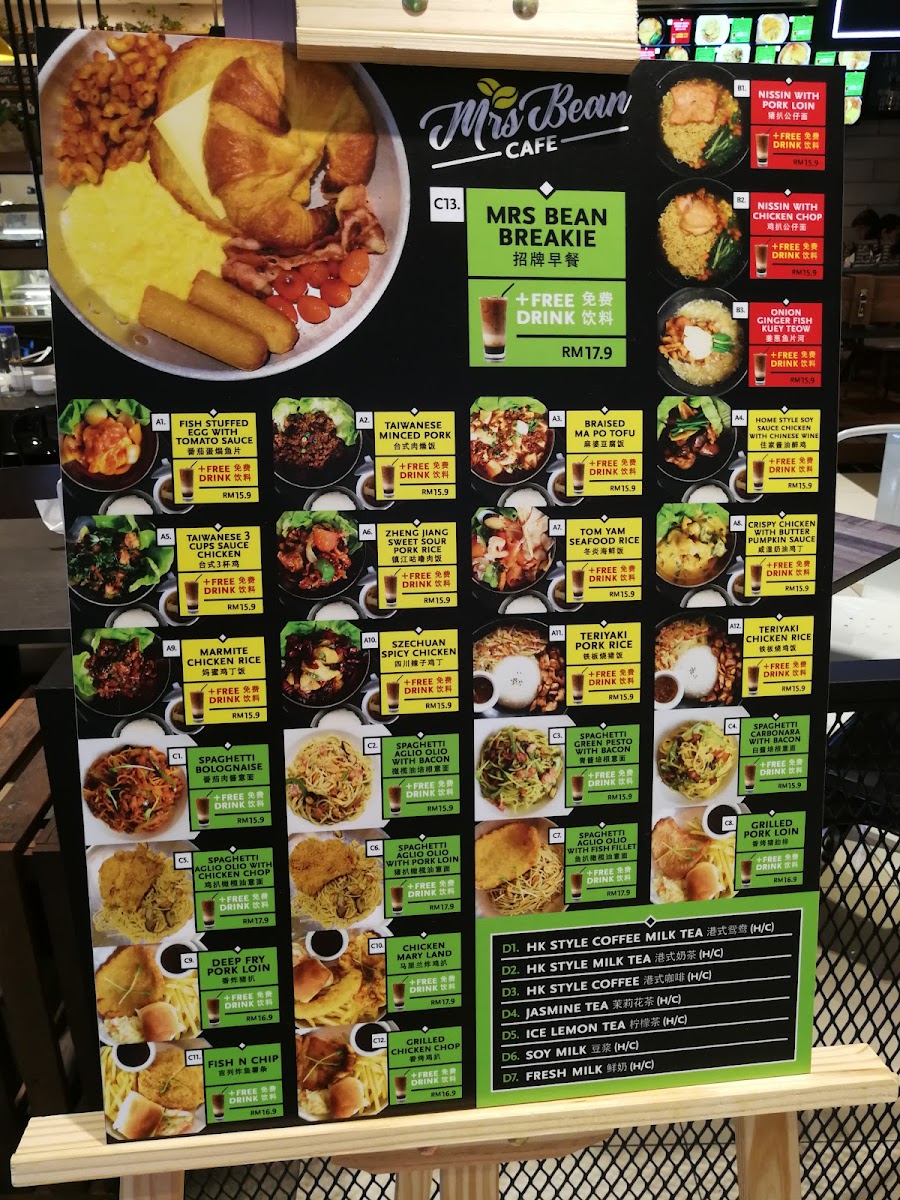 The menu at Mrs Bean Cafe offers a selection of set meals suitable for quick and casual dining. The offerings include a variety of Asian rice dishes and Western-style meals, reflecting a fusion approach. Typical meals come paired with a drink, providing a complete set at an affordable price point.
